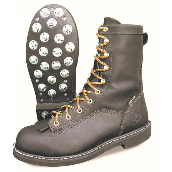 Georgia crafted these Insulated Lace-To-Toe Work Boots with black full-grain leather; the material is tough and durable, yet remains naturally soft. All of the boot eyelets and stud hooks have been attached to steel washers, so you won't have to worry about them being pulled off while you're working. The lace-up design allows your feet to rest securely, and it enables you to adjust the boots for a comfortable fit. This product is built with quality waterproofing materials to keep you dry in wet environments.